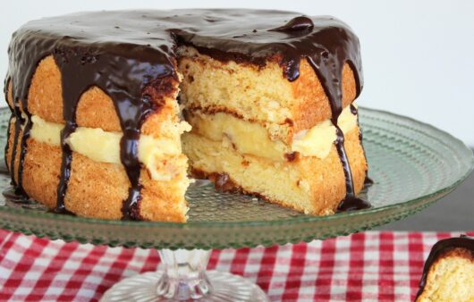 Δυό στρώσεις με αέρινο sponge cake, πλούσια κρέμα πατισερί βανίλια και γκανάς σοκολάτας. Το Boston